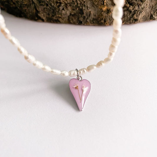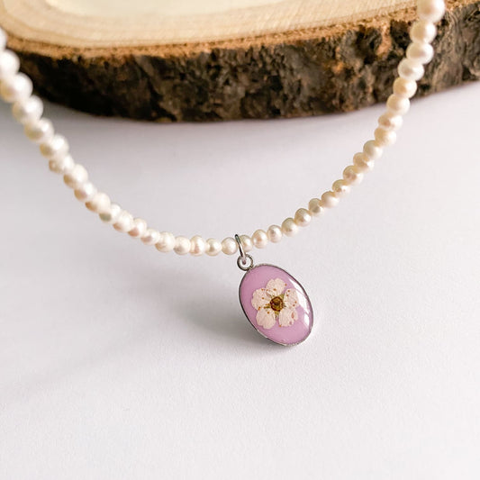 Colier cu perle de cultură, fundal roz și flori albe