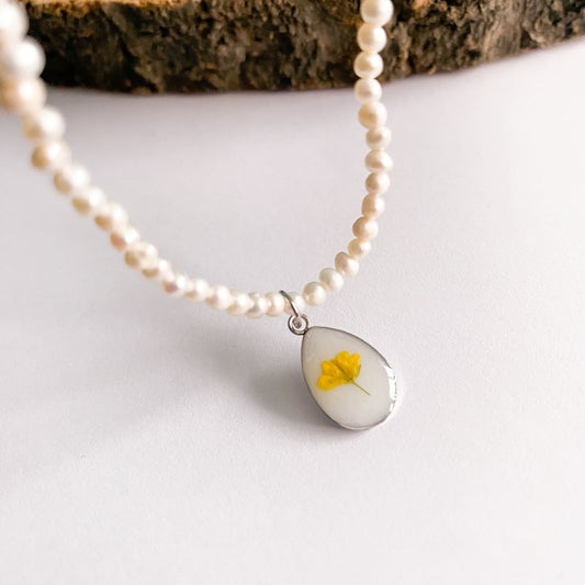 Colier cu perle de cultură, fundal alb și floare galbenă