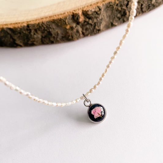 Colier cu perle de cultură, fundal negru și floare roz