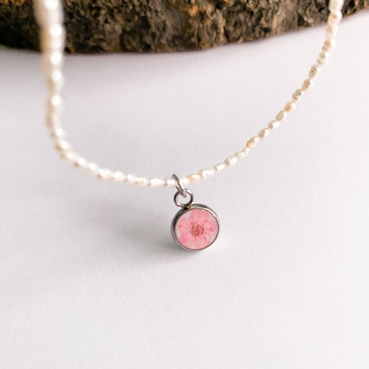 Colier cu perle de cultură, fundal roz și floare albă