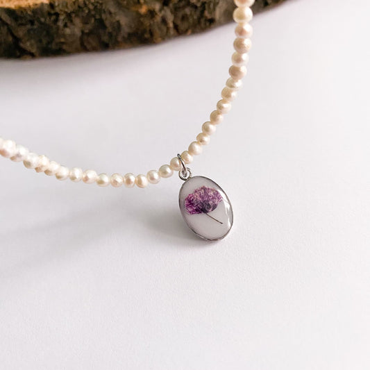 Colier cu perle de cultură, fundal alb și floare mov