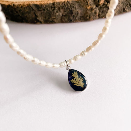 Colier cu perle de cultură, fundal negru și frunzuliță