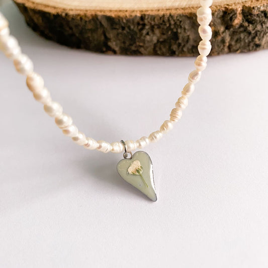 Colier cu perle de cultură, fundal verde și floare albă