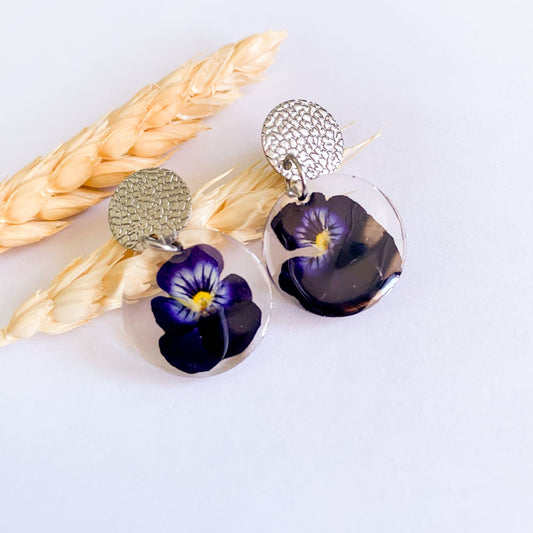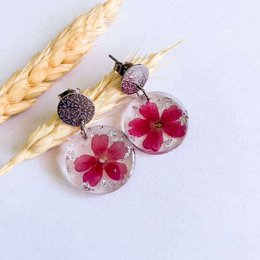 Cercei rotunzi cu flori roz închis și foiță argintie