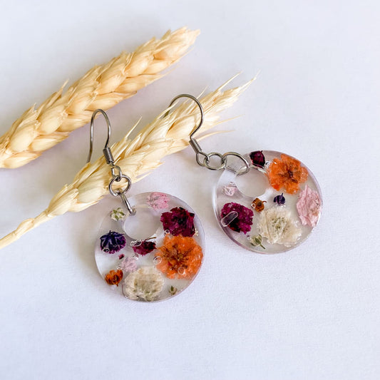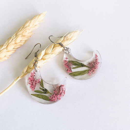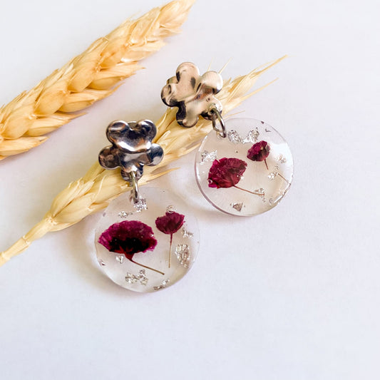 Cercei rotunzi cu flori roz bordo și foiță argintie