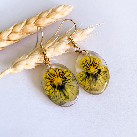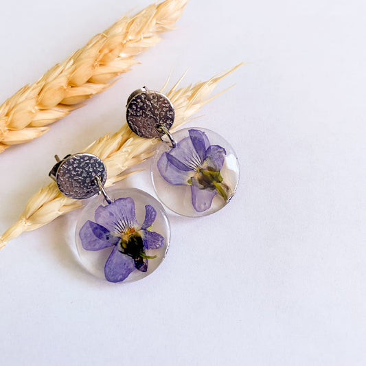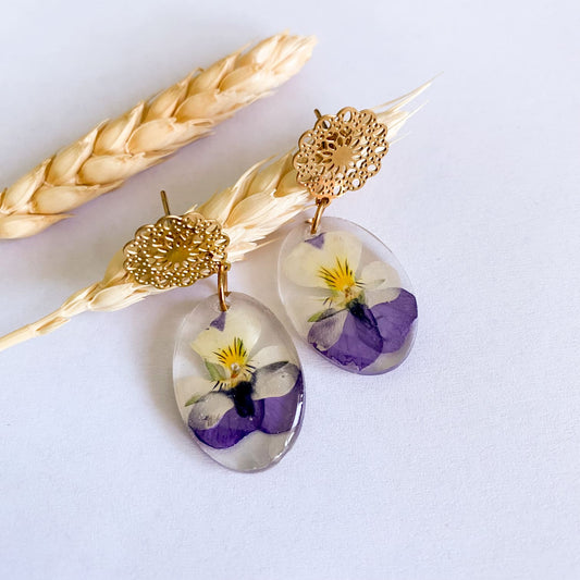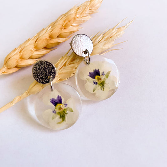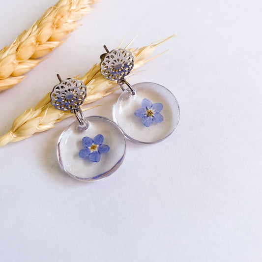 Cercei ovali cu flori de Nu-mă-uita și frunze