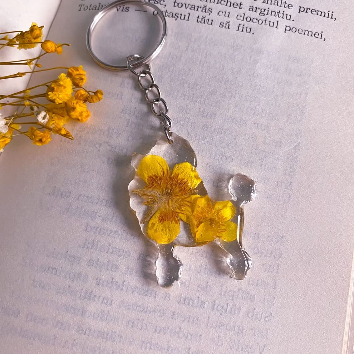- Materiale folosite: rășină epoxidică, flori naturale, inel breloc din metal.