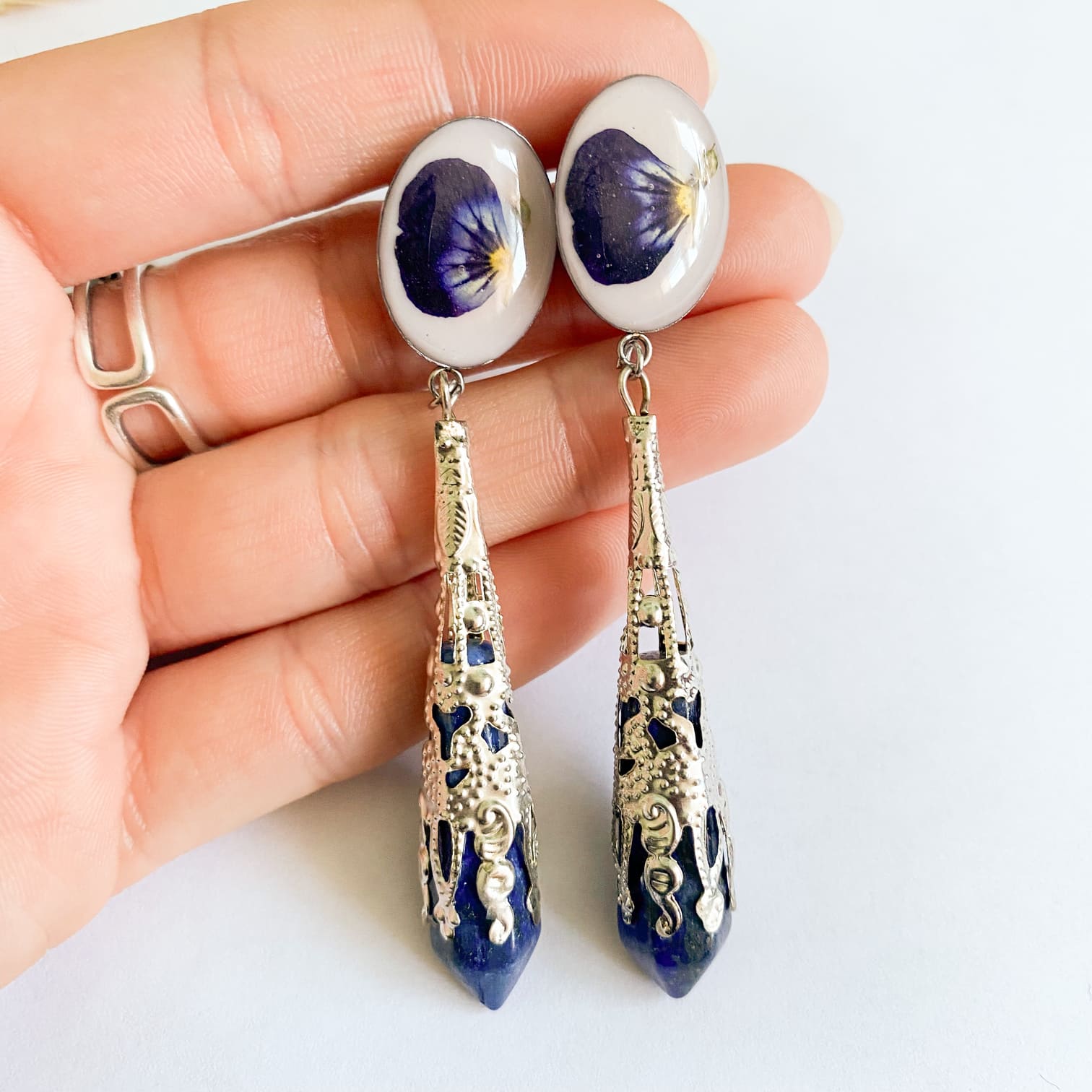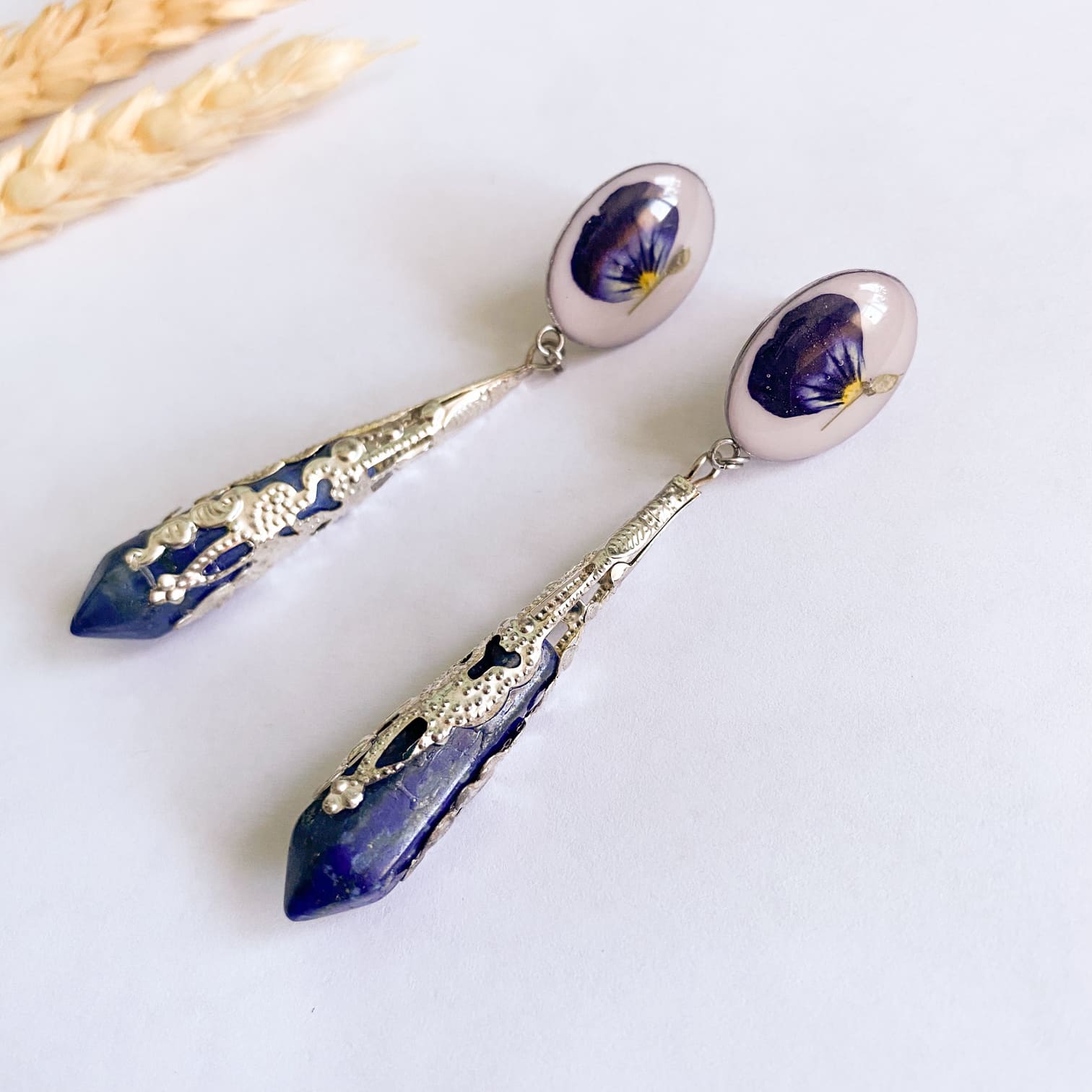 - Materiale folosite: rășină UV, flori naturale, accesorii din oțel inoxidabil, pandantive cu lapis lazuli