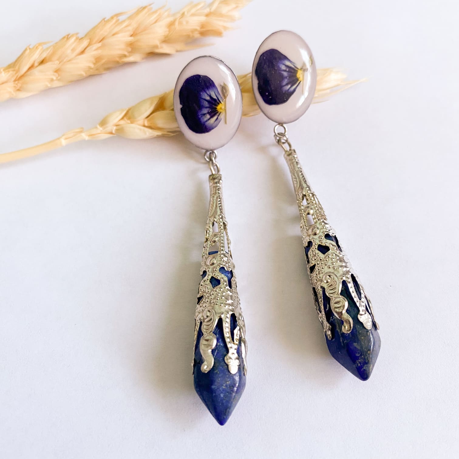 Cerceii Zendora cu flori naturale sunt alegerea ideală pentru un cadou, atât pentru tine, cât și pentru persoanele dragi din viața ta. Inspirați din natură, conțin flori naturale încapsulate în rășină, pandantive din lapis lazuli și accesorii elegante din inox.