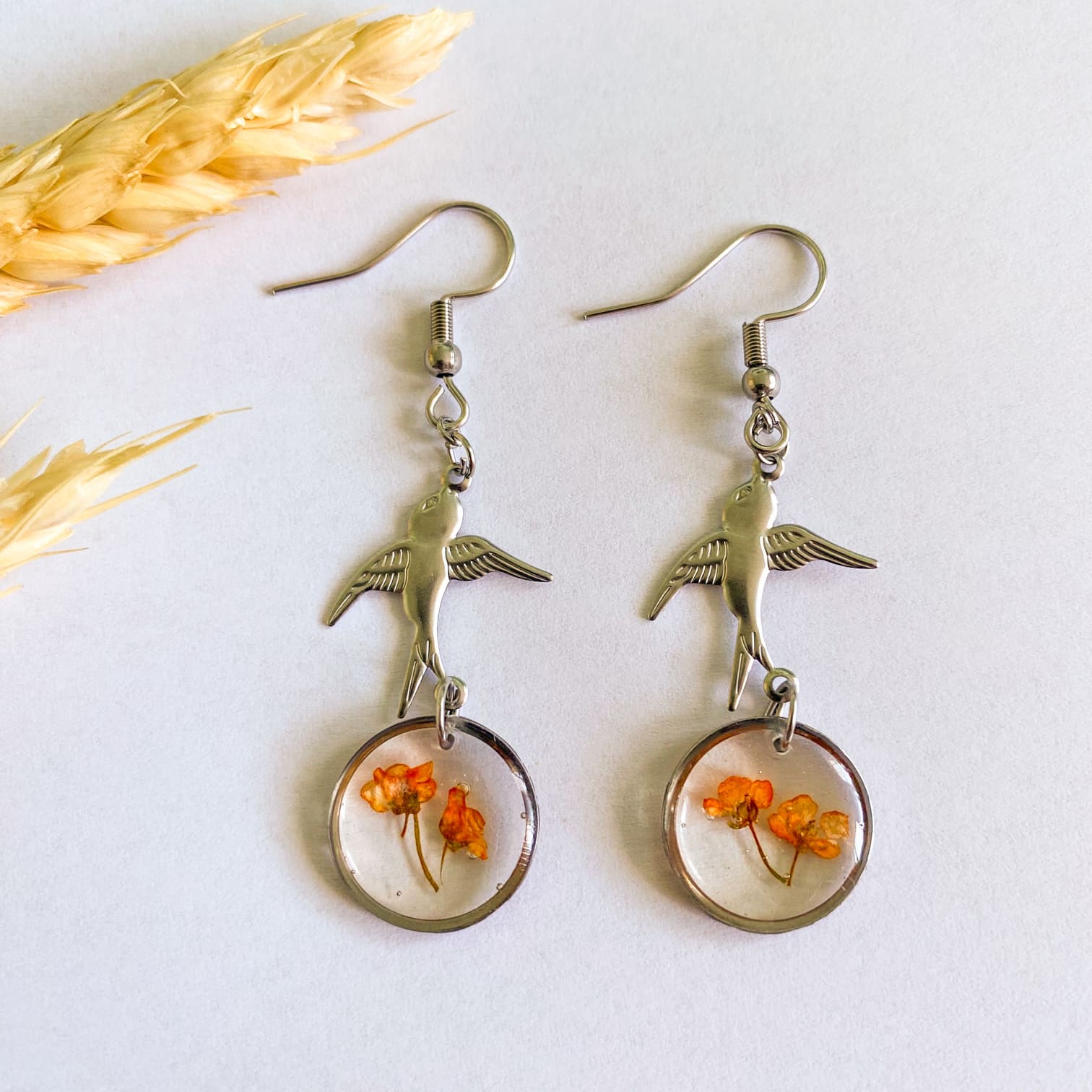 Cercei cu flori portocalii și accesorii argintii în formă de rândunele
