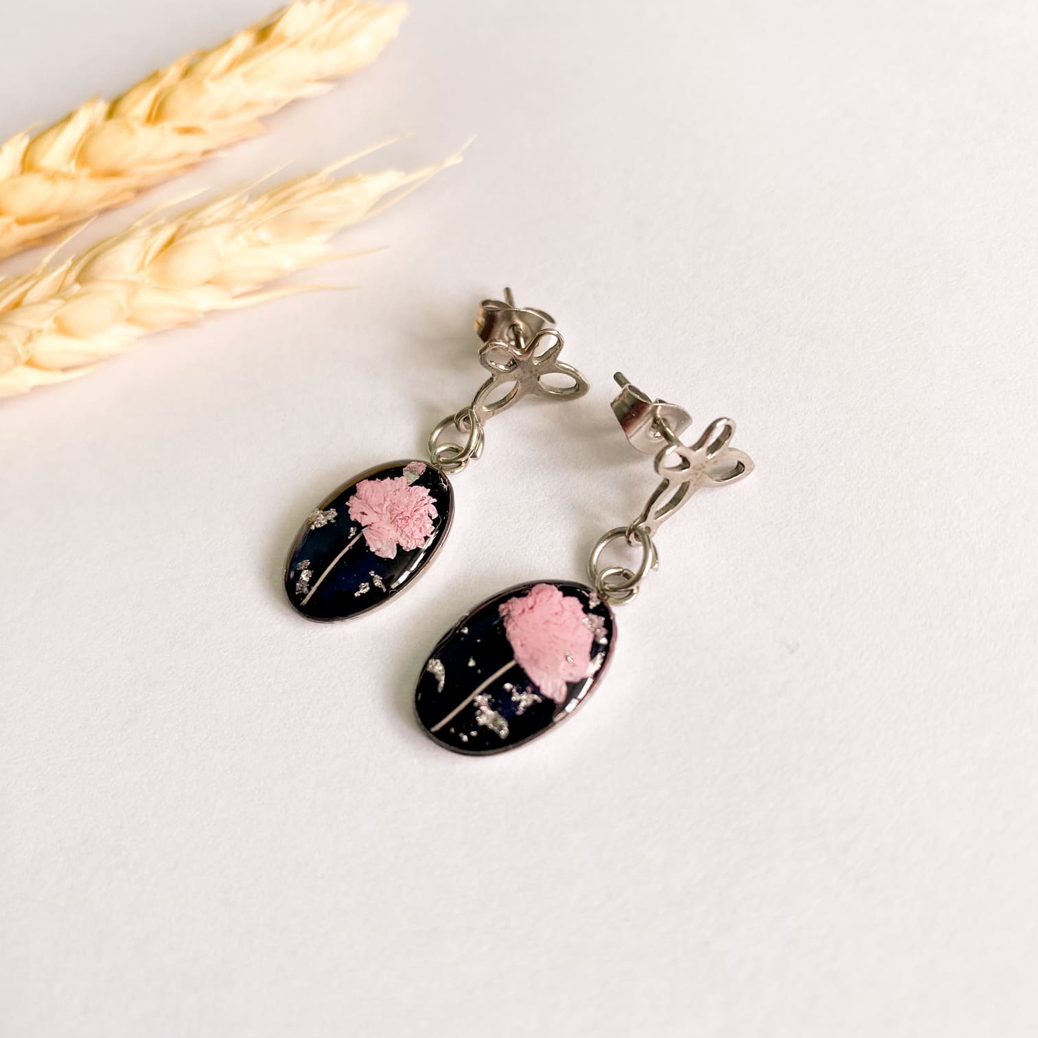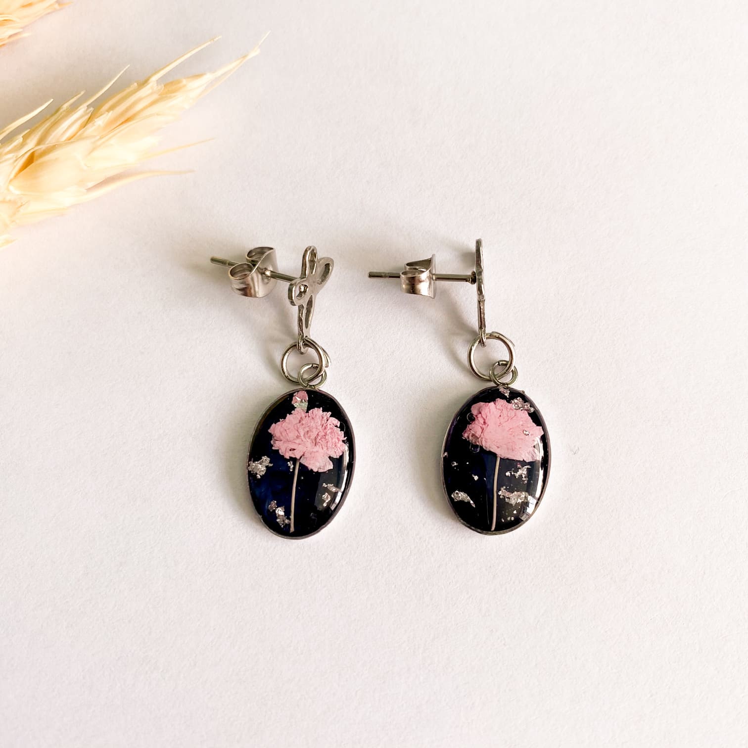 - Materiale folosite: rășină UV, flori naturale, foiță argintie, accesorii din oțel inoxidabil.