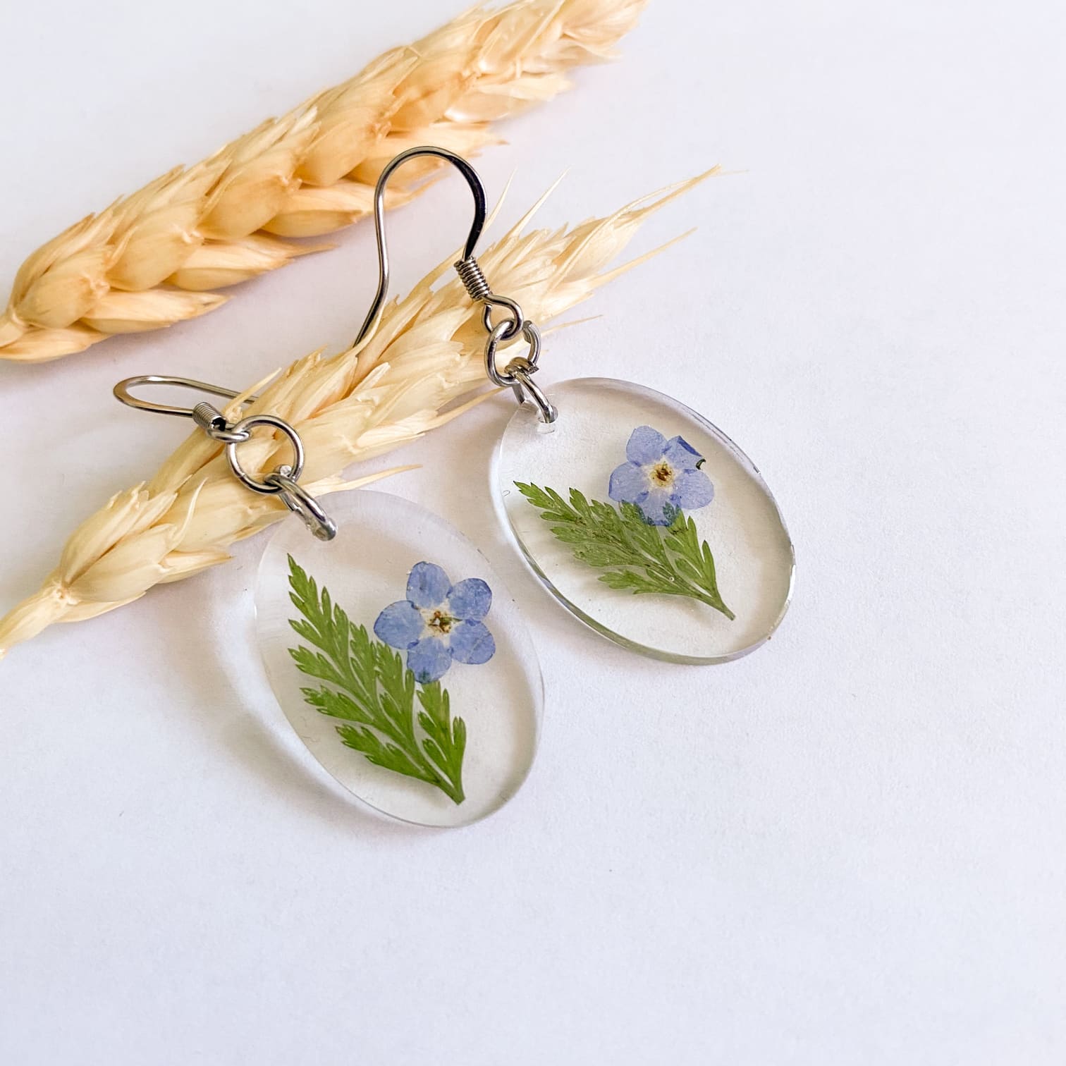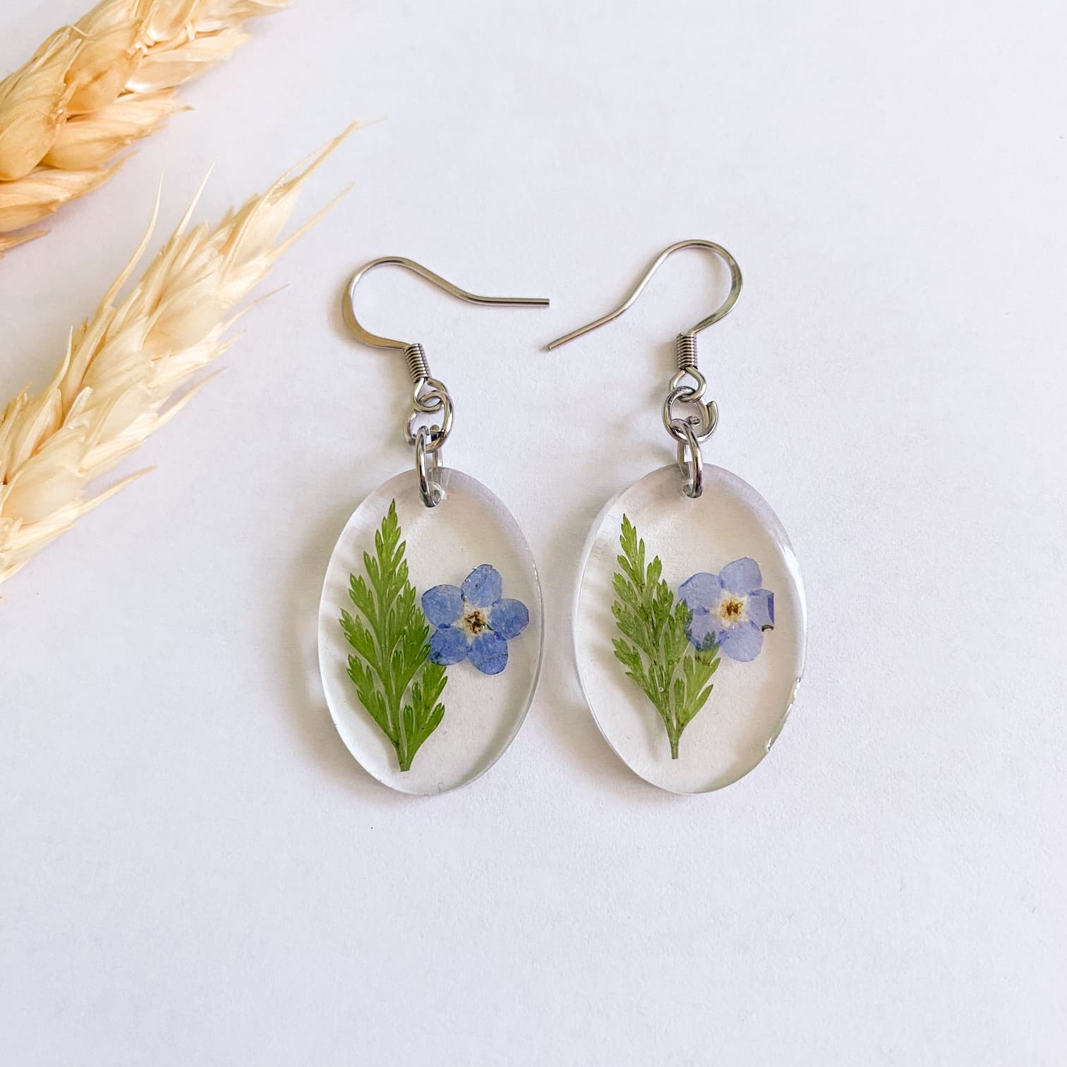 Cercei ovali cu flori de Nu-mă-uita și frunze