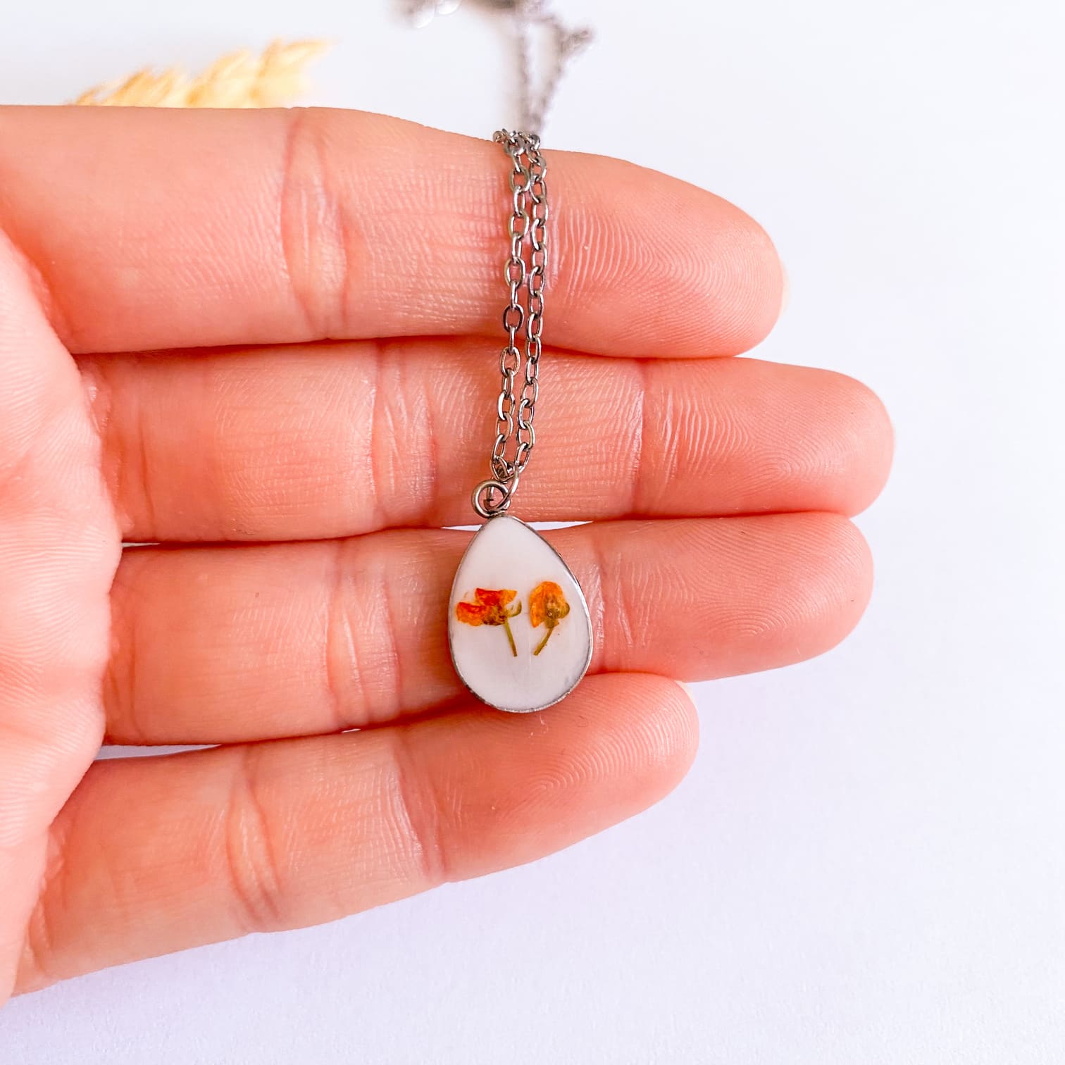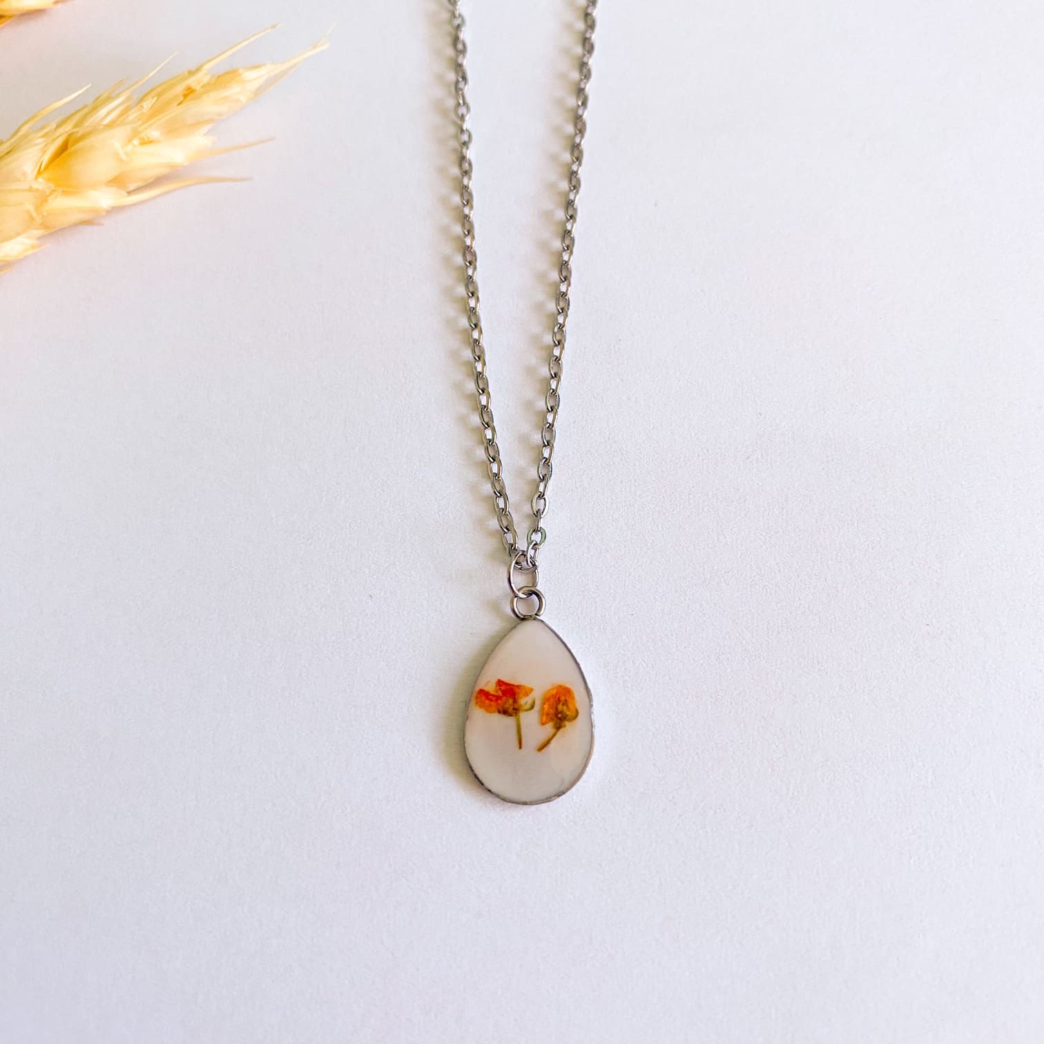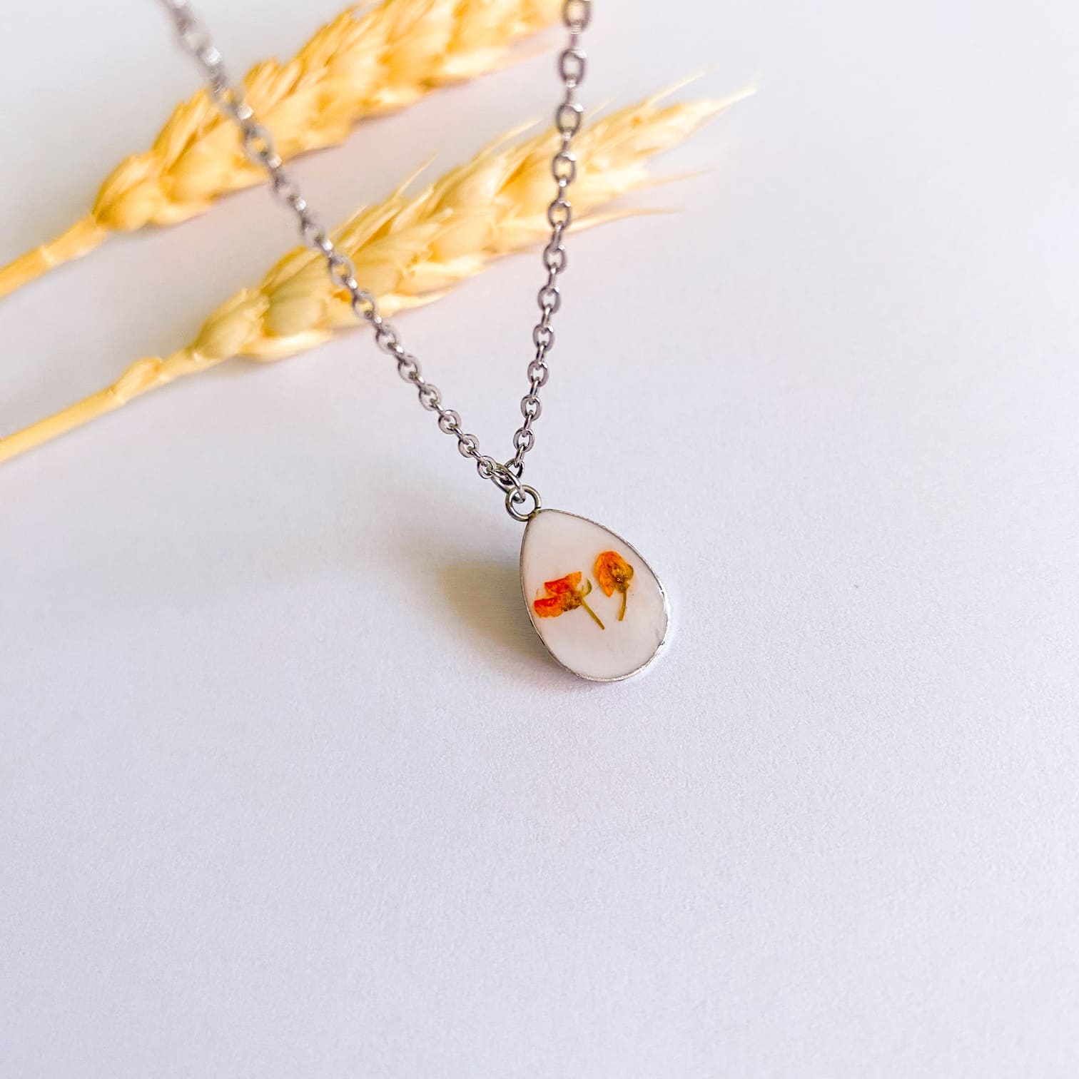 - Materiale folosite: lanț și accesorii din inox, rășină UV, floare naturală.