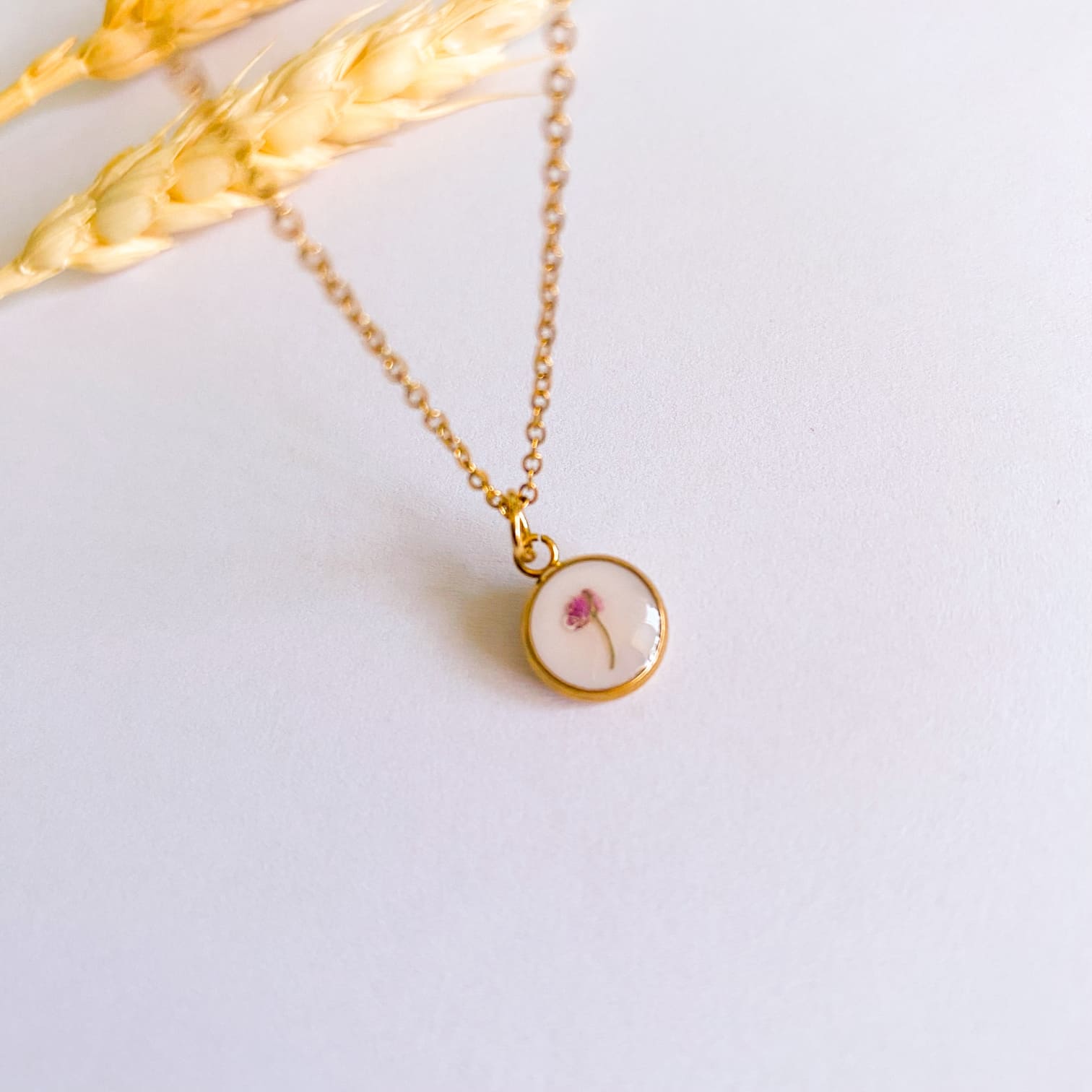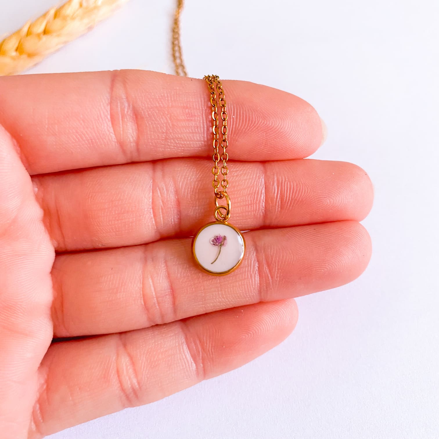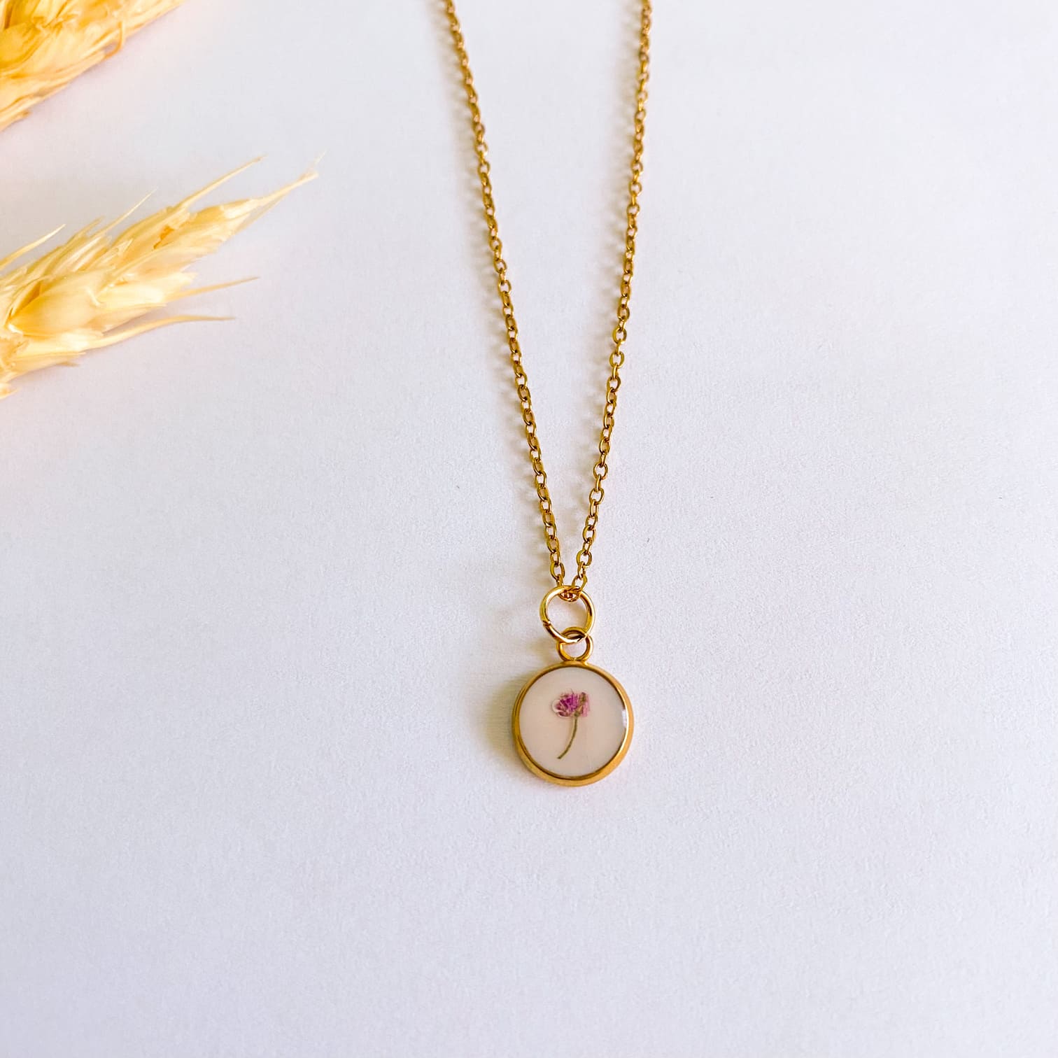 - Materiale folosite: lanț și accesorii din inox, rășină UV, floare naturală.
