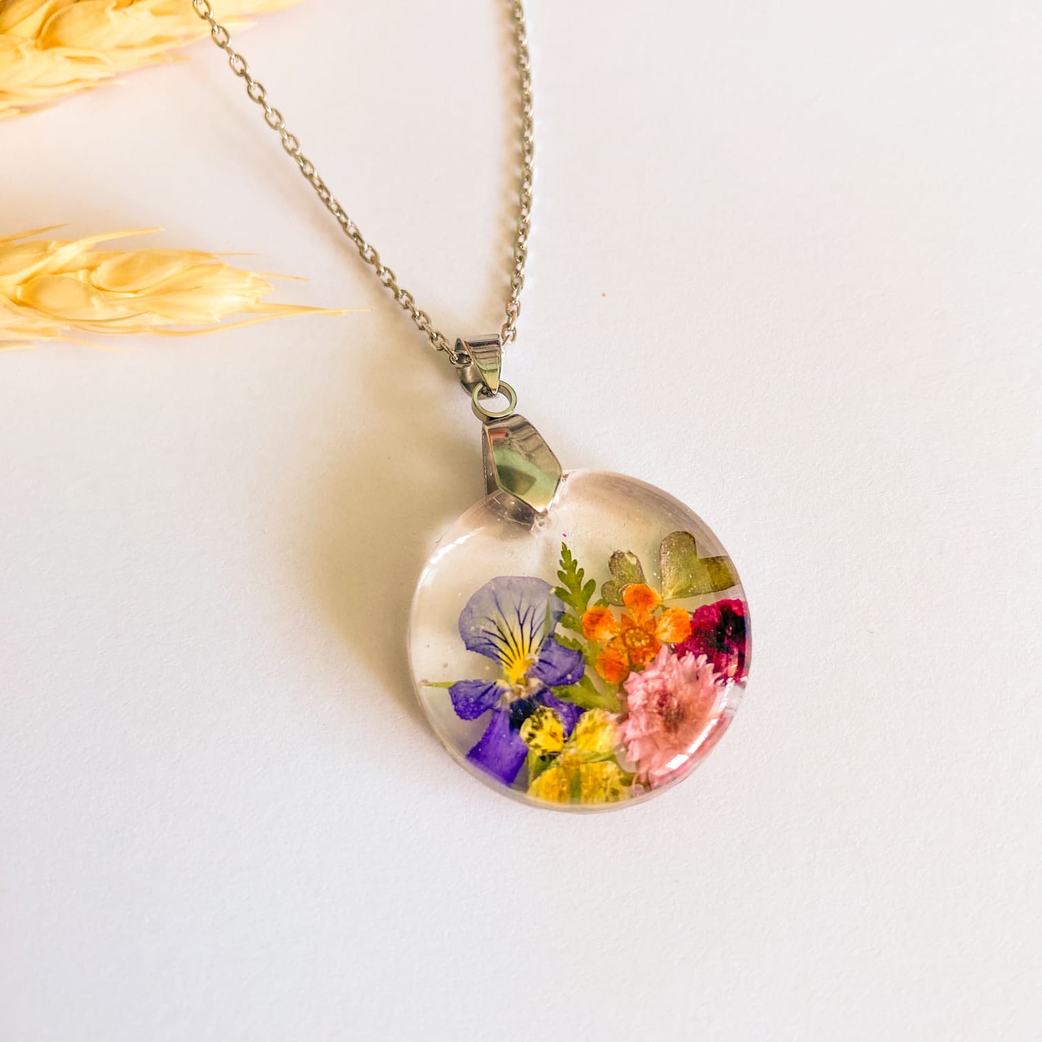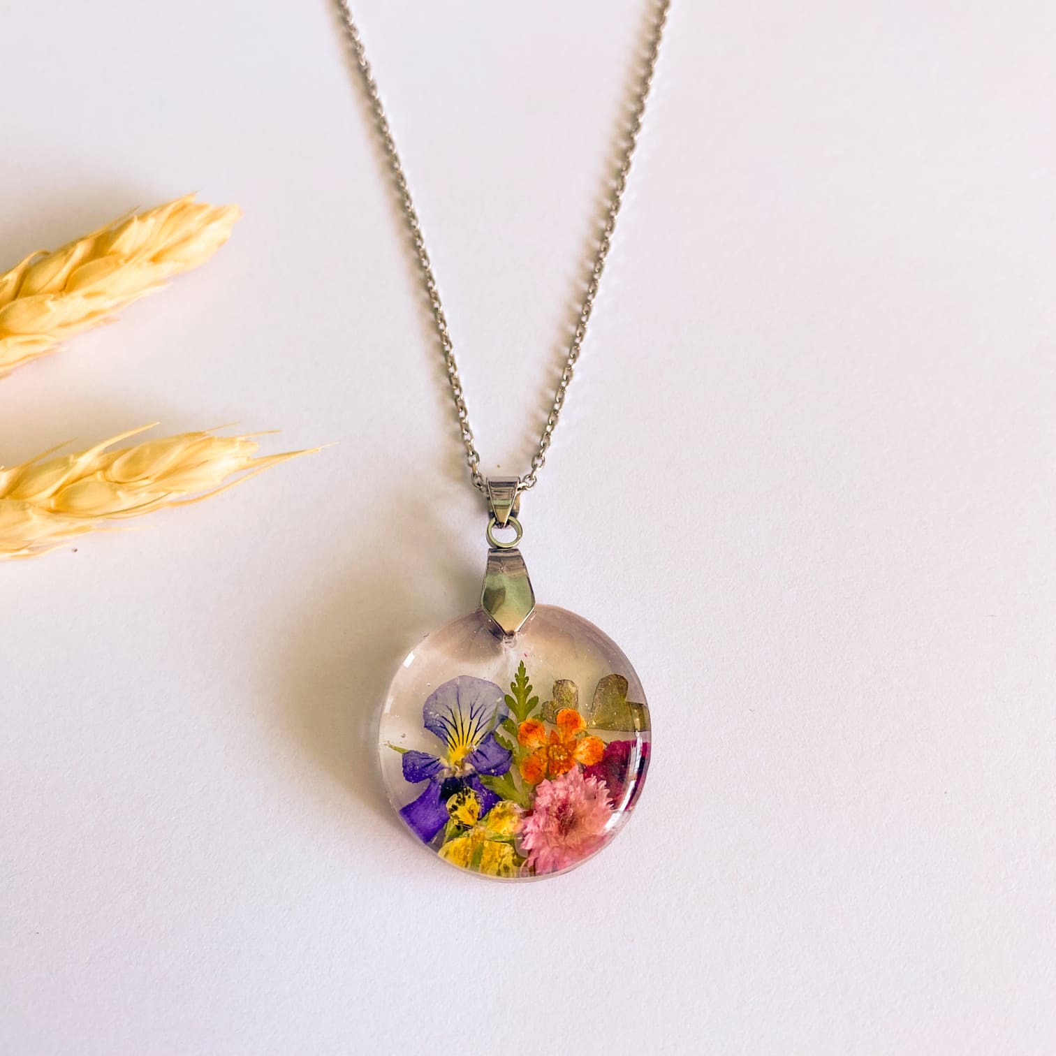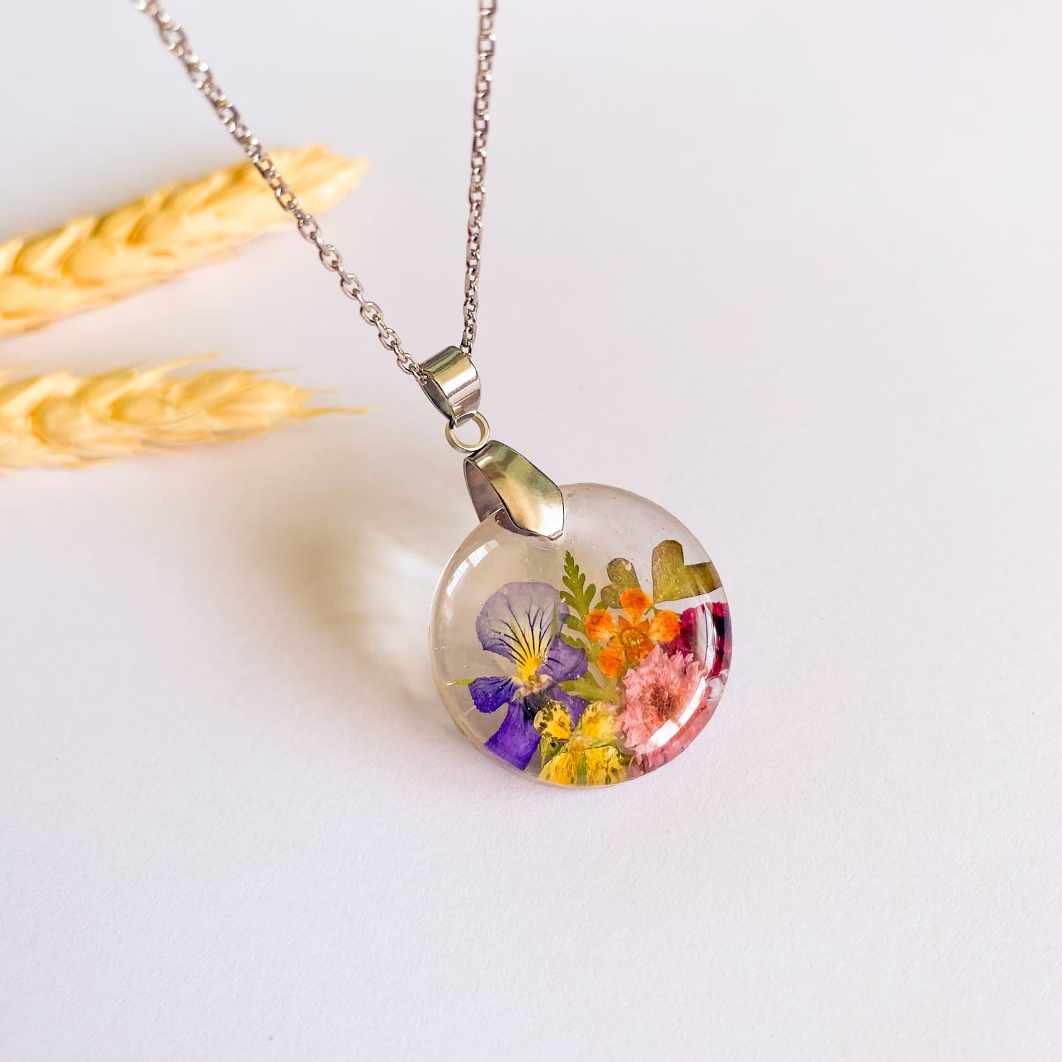 - Materiale folosite: lanț și accesorii din inox, rășină UV, flori naturale.