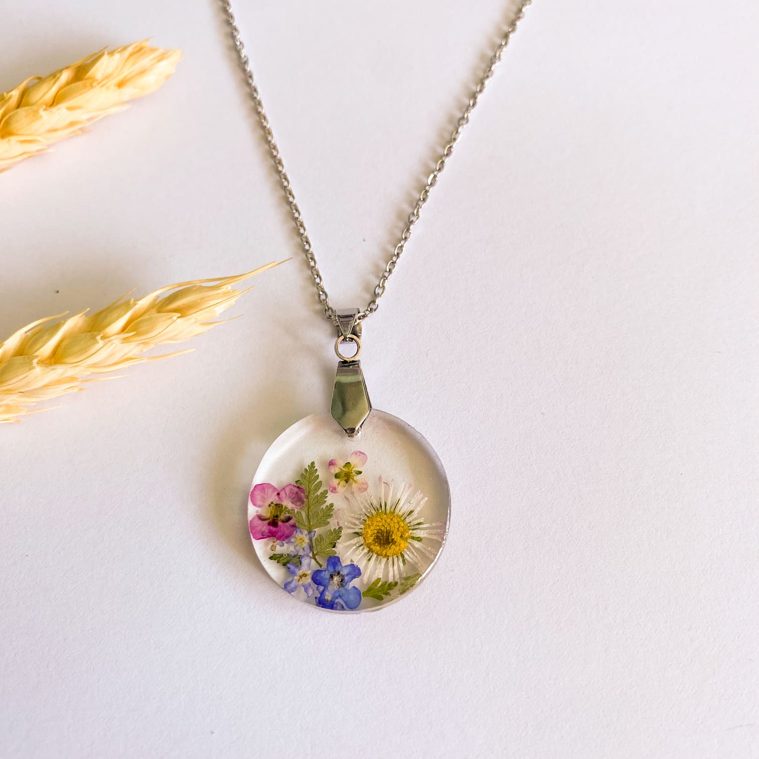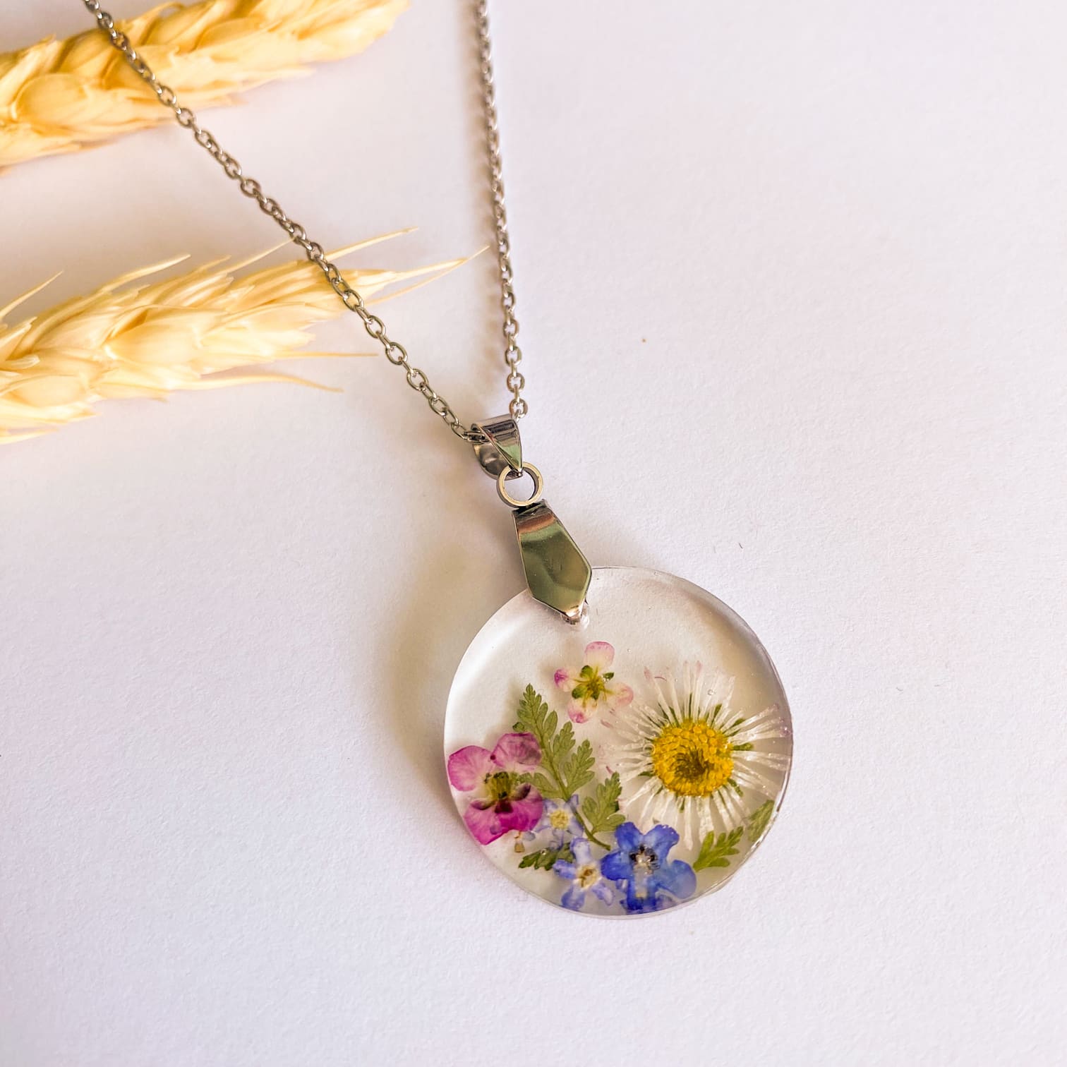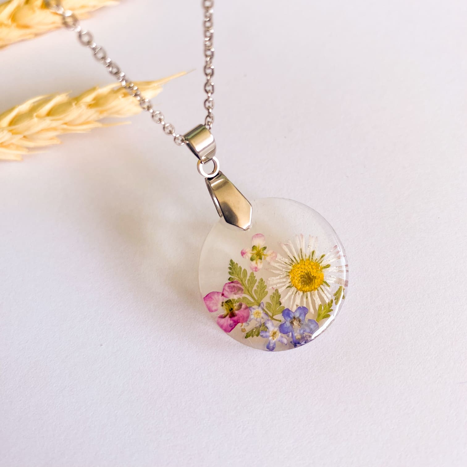 - Materiale folosite: lanț și accesorii din inox, rășină UV, flori naturale.