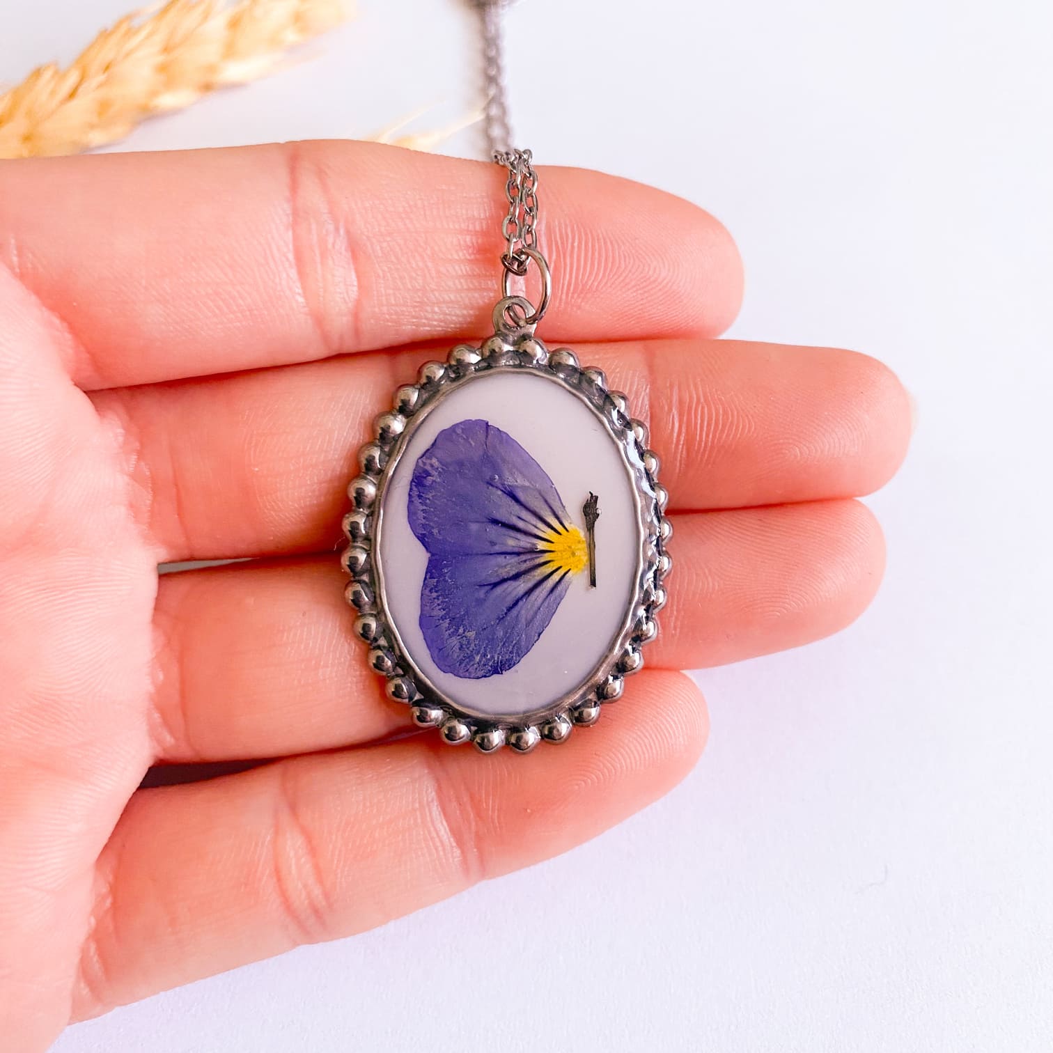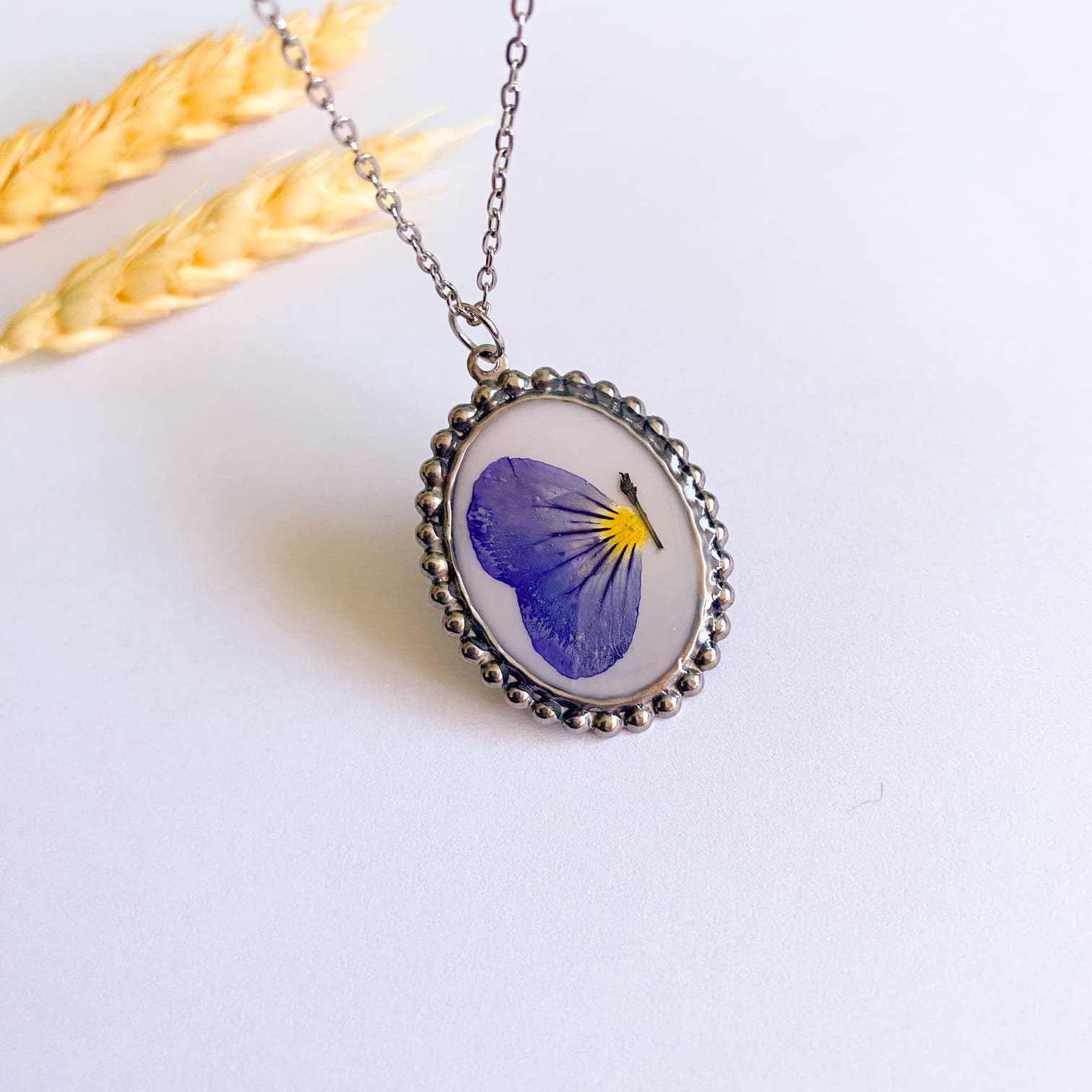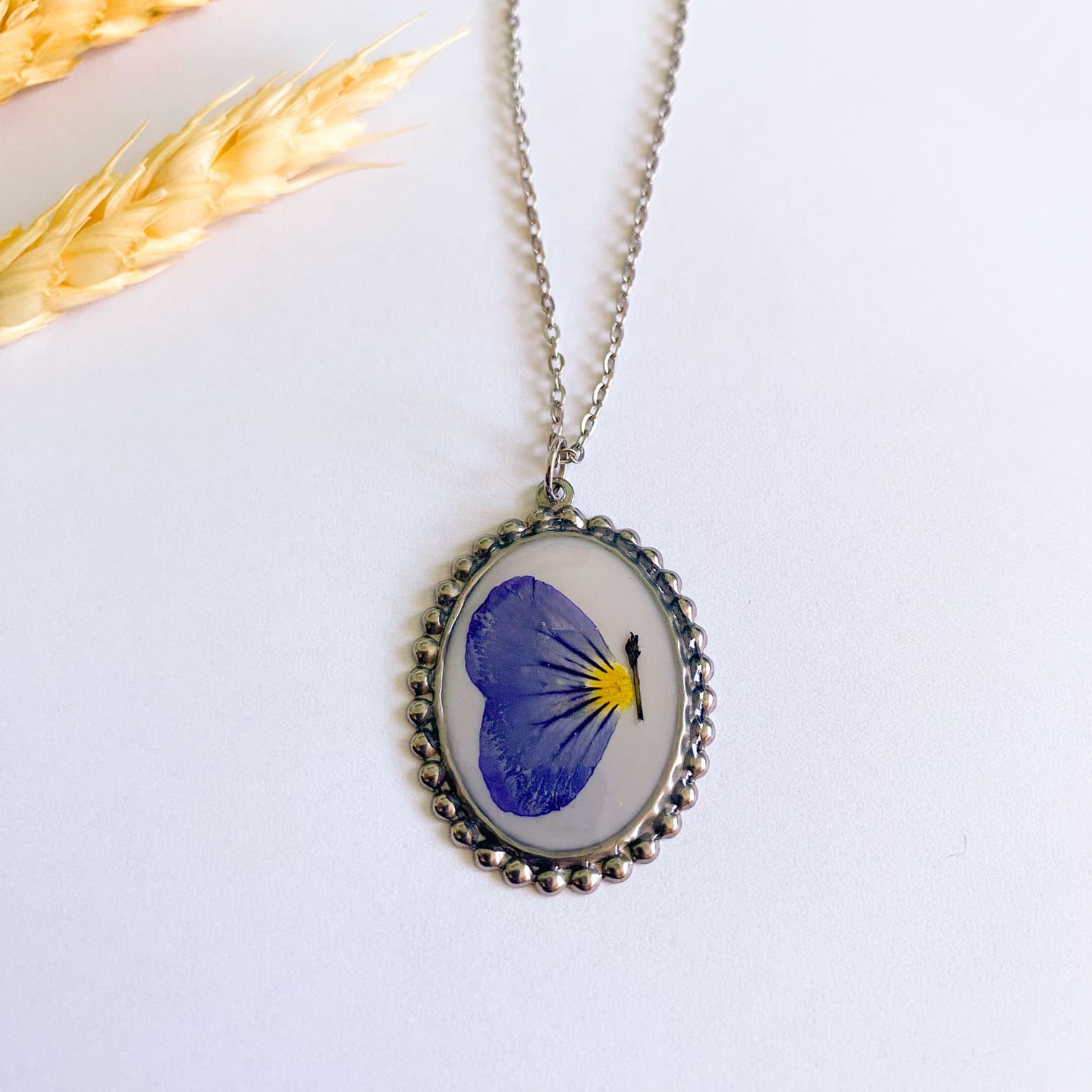- Materiale folosite: lanț și accesorii din inox, rășină UV, floare naturală.
