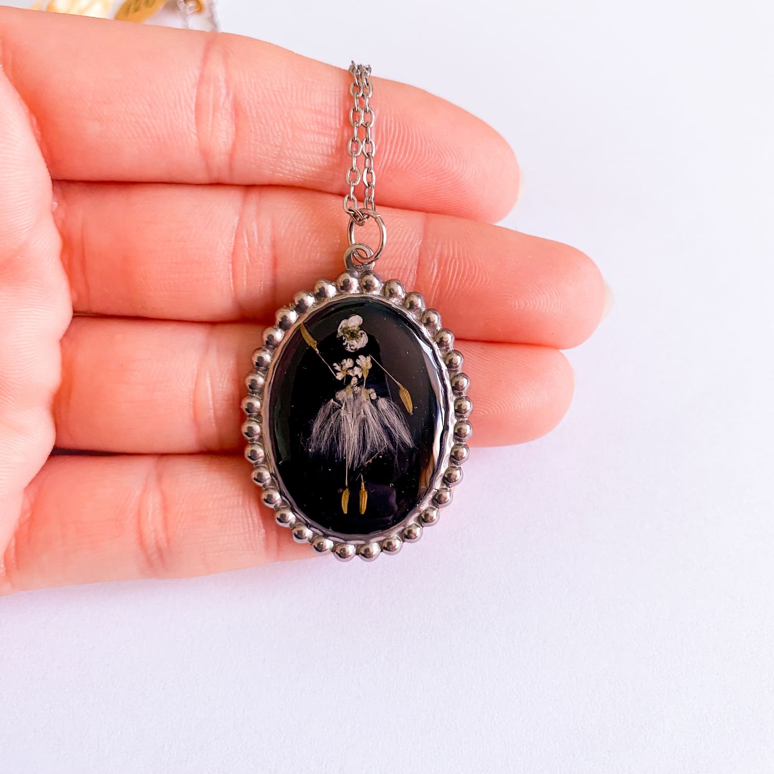 - Materiale folosite: lanț și accesorii din inox, rășină UV, floare naturală.