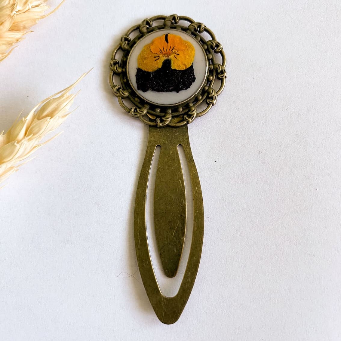 Semn de carte handmade cu aspect vintage, ce conține o panseluță încastrată cu grijă în rășină UV. Este perfect pentru pasionații de citit și cei care vor să păstreze cu ei o părticică din natură.